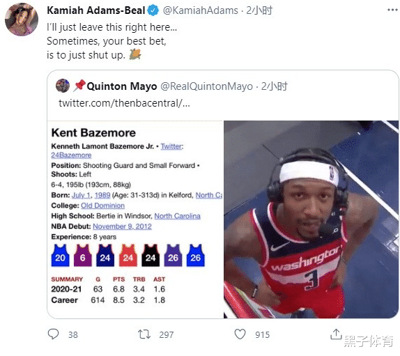 借用比尔妻子说的一句话:谁都没有必要贬低一个人来抬高另一个人,这是软弱的人才有的性格特征。(贝兹莫尔在接受采访时谈到了库里,隐晦地提到了比尔:“29分钟得了49分,这太不真实了。这让有些家伙伤了腿筋才能跟上。”)