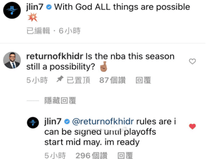 这也是林书豪此前和球迷们互动时候说到的,他可以在季后赛之前联系和签约任何的球队,原话是:“规则是在5月中旬季后赛开始前,我还是可以签约的,我准备好了。”