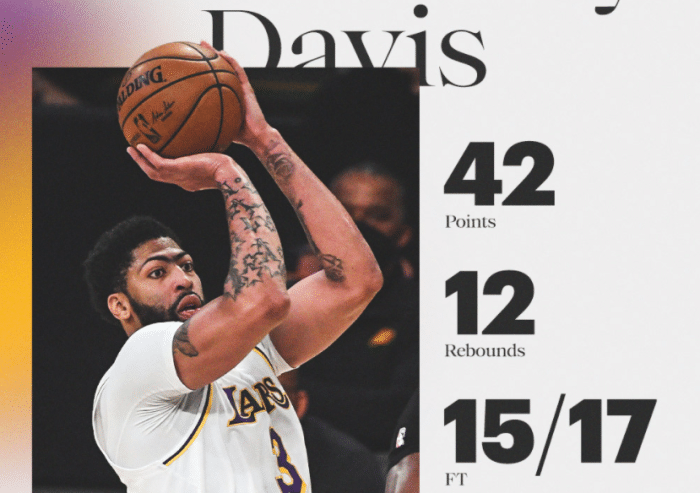 JRS直播网讯 北京时间5月10日,面对战绩排在全联盟第2的太阳,湖人在残阵情况下凭借浓眉哥打出赛季最佳表现最终获得胜利。这场比赛,浓眉哥足足拼了41分钟,攻防两端不留余力狂砍42分12板5助攻3抢断3盖帽的全面数据!是湖人队史近20年第一位打出这串数据的球员!戴维斯的疯狂表现引来众美媒热议!