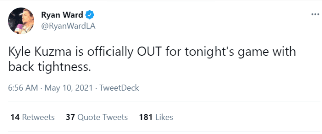 JRS直播网讯 北京时间5月10日,湖人官方宣布,库兹马因腰部肌肉紧张缺席今日对太阳的比赛。一天前,库兹马的状态就列为doubtful(大概率不打),而今天赛前,库兹马的状态正式更改为OUT(缺阵)。詹姆斯、施罗德仍未复出,湖人缺兵少将的问题变得更加严重。