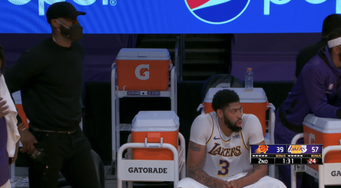 JRS直播网讯 北京时间5月10日,湖人和太阳比赛中,詹姆斯坐在场边为队友鼓劲,浓眉延续火热手感,半场15投8中拿到22分5篮板1盖帽1助攻,在场正负值+17,浓眉把鞋都拼掉了;詹姆斯关心浓眉,多次走到浓眉面前和他互动,期待湖人双巨再次合体。