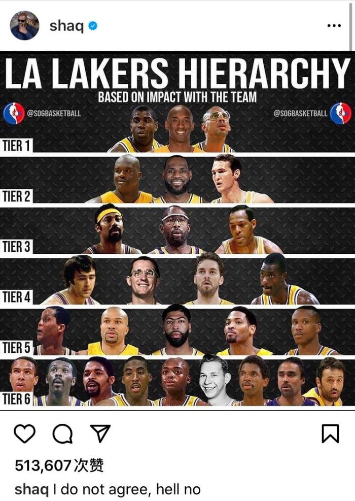 JRS直播网讯 北京时间5月9日,前湖人名宿奥尼尔在社媒上晒出了一张由媒体制作的湖人队史球员分档图,分档基于他们的荣誉、带队能力、影响力等多个因素,奥尼尔附文“我不同意,绝不。”