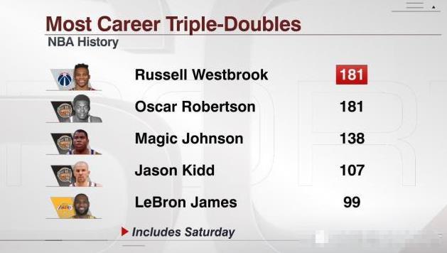 JRS直播网讯 对于威少来说,这是他球员生涯最重要的一天。就比赛而言,步行者对着奇才,两支季后赛大门外的球队互啄,可是这场比赛如果奇才赢了,他们还是有机会冲击季后赛。就威少而言,如果本场比赛,他能够再次拿到三双,他将比肩传奇名宿“大O”,成为NBA历史三双次数第一的存在。