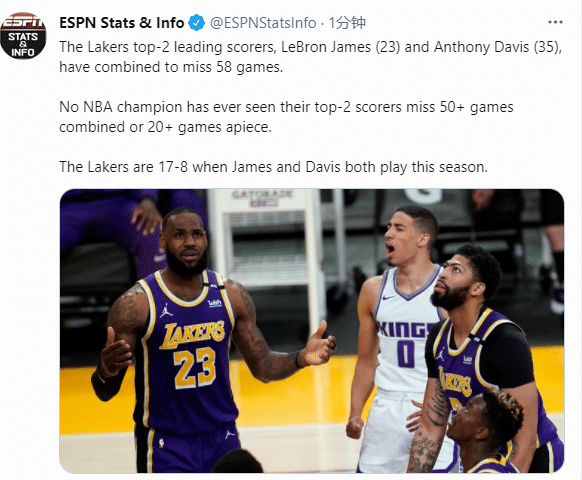 JRS直播网讯 北京时间5月8日,ESPN晒出一组数据扎心湖人。赛季至今,球队前二得分手詹姆斯和安东尼-戴维斯总计缺席了58场比赛。放眼全联盟历史,没有任何一个球队能在前二得分手缺席50场以上比赛,或者各自缺阵20场以上比赛的情况下,最终完成夺冠神迹。从这个角度来看,本赛季湖人想要卫冕难度不小。