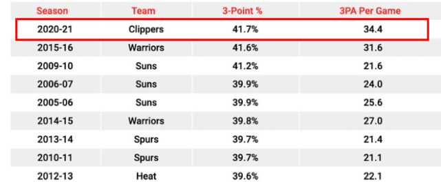 JRS直播网讯快船还剩5场常规赛,他们有望打破一项三分纪录,成为NBA历史上单赛季三分最准的球队!赛季至今,快船场均三分出手34.4次,命中14.4次,三分命中率高达41.7%,是全联盟唯一一支三分命中率超过四成的球队。
