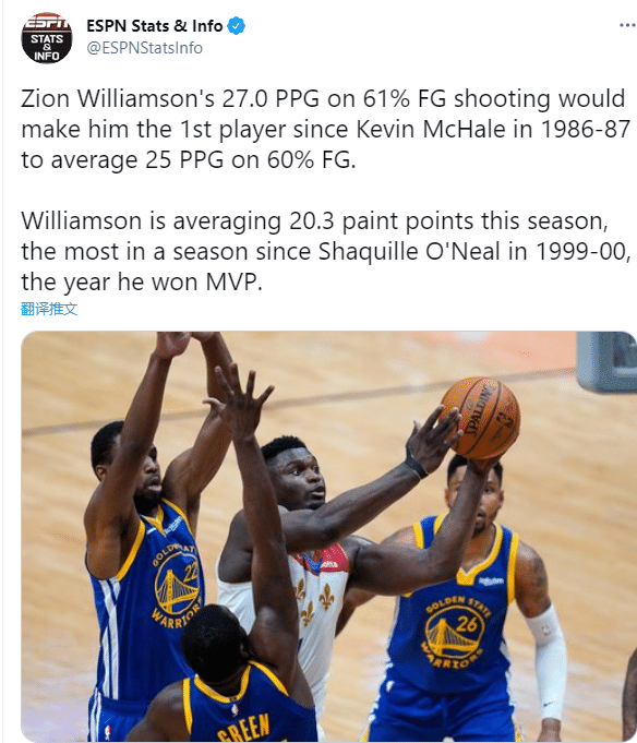 锡安本赛季场均能够轰下27分7.2篮板3.7助攻0.9抢断0.6盖帽,投篮命中率高达61.1%,禁区场均20.3分比肩奥尼尔,是00年奥尼尔夺得MVP后禁区得分最高的球员;场均27分且命中率至少60%,成为此项纪录历史第一人;锡安生涯前85场比赛总共拿到2187分,成为NBA近40年第四位前85场得分2000+的球员,只有乔丹(2387分)比他得分更多。