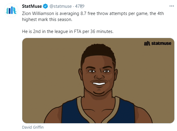 锡安无限期休战真该怪裁判吗?美媒Stat Muse晒出罚球数据——本赛季锡安场均获得8.7次罚球,排在联盟第四位,每36分钟获得罚球次数联盟第二高。