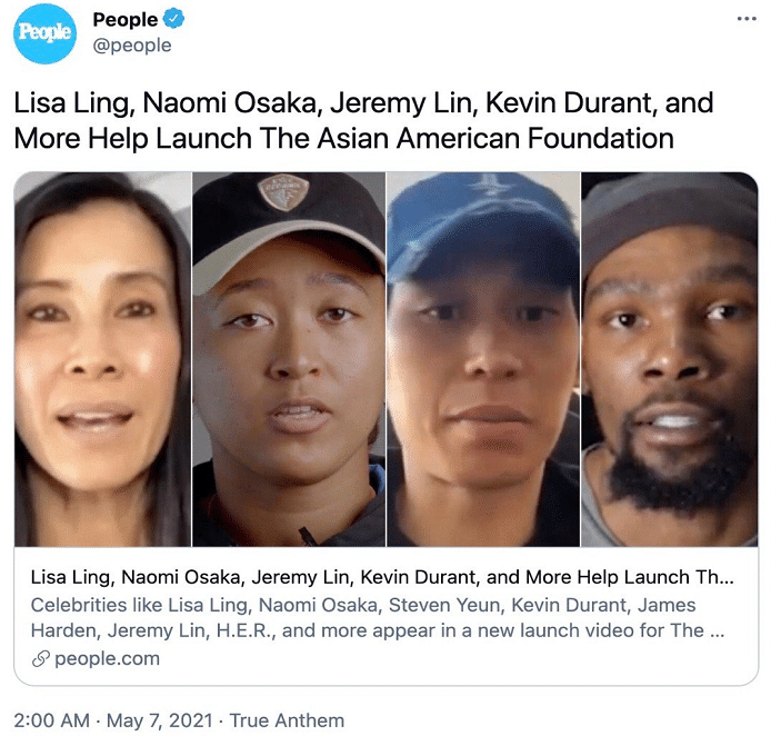 JRS直播网讯 前段时间外媒报道篮网老板蔡崇信联合沃尔玛、美国银行和NBA联盟等一起成立亚裔基金会,其中蔡崇信和雅虎联合创始人杨致远等人承诺投入1.25亿美元,沃尔玛和NBA联盟等筹集1.25亿,加起来是2.5亿美元,用于支持亚裔社区发展、改变外界对于亚裔的看法,这样的举动收获了外界一片的赞誉。而现在传来消息,凌志慧、大阪直美,林书豪以及凯文杜兰特协助成立了亚裔基金会。