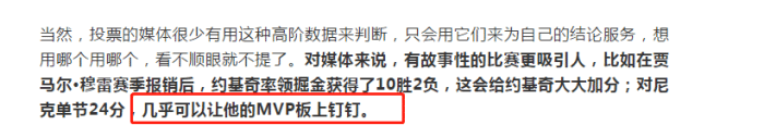 国内篮球名嘴苏群也谈到了约老师的表现,在苏群看来,MVP基本上板上钉钉了,没悬念。“穆雷赛季报销后,约基奇带领掘金取得10胜2负,这会给约基奇大大加分,对尼克斯单节24分,几乎可以让他的MVP板上钉钉了”。