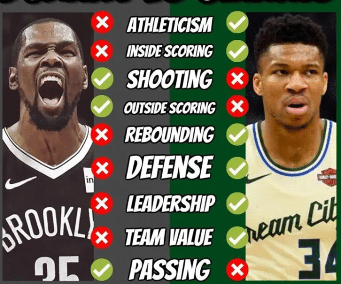 JRS直播网讯 近些年来,NBA进入了小前锋统治的时代,先有詹姆斯、杜兰特,后有伦纳德、字母哥。一众球星在攻防两端都有绝对的统治力。因为都处于锋线位置,所以不免会拿来比较。同是作为身高臂长的字母哥和杜兰特,到底谁强谁弱呢?美媒列出数据,对二人进行了全方位对比。结果发现,字母哥除了投篮次数,场外得分,以及二人交手胜率不及杜兰特外,在其他方面,字母哥都完胜杜兰特。