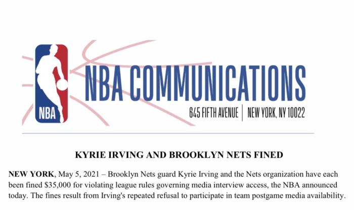 JRS直播网讯北京时间5月6日,NBA官方开出一笔重大罚单,篮网球星凯里-欧文和篮网队因违反联盟采访规定都被罚款35000美元,NBA官方声明罚款真因——欧文多次拒绝赛后媒体采访,不仅违规被罚款,还牵连篮网遭处罚,累计罚款7万美元。