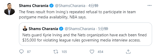 去年12月份,欧文就因拒绝接受赛后采访而被罚款2.5万美元,当时篮网受牵连也被罚2.5万美元;如今欧文再次违规被罚款,篮网也被罚3.5万美元;本赛季欧文已经两次被罚并导致篮网被罚款,累计罚款总额高达12万美元。