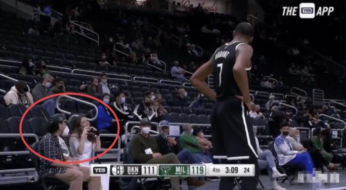 昨天的杜兰特前三节有多牛呢?前三节比赛,杜兰特16中10,拿到了30分8篮板5助攻,也是因为杜兰特出色的表现,篮网队才能挡住三节比赛拿到30分9篮板的字母哥。比赛来到第四节攻坚阶段的时候,有趣的一幕出现了,雄鹿场边的一个美女球迷开始和杜兰特搭讪。
