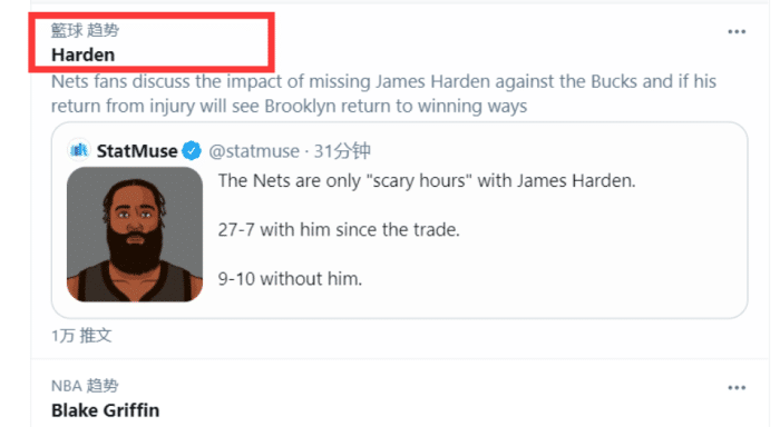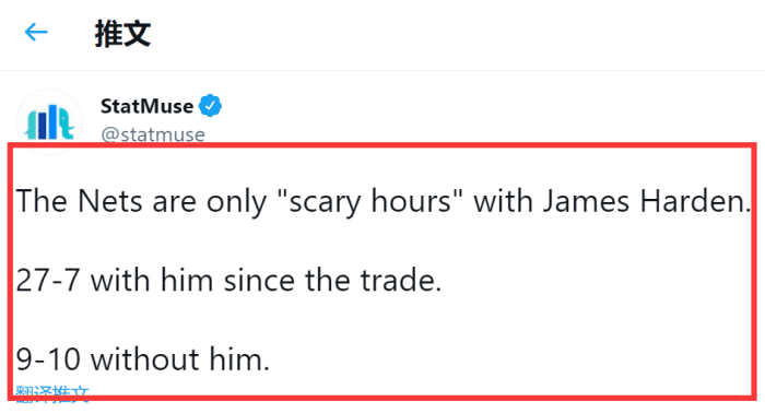 这些球迷的言论并不是盲目吹捧,据美媒statmuse统计,在哈登被交易到布鲁克林后,当他出战时篮网取得了27胜7负,胜率高达79.4%。但哈登不在时,篮网仅9胜10负胜率不到50%,这支篮网确实只在有哈登的时候才会是“scary hours”(恐怖时刻)!
