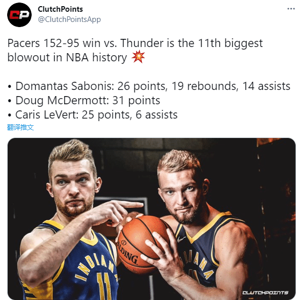 JRS直播网讯北京时间5月2日,步行者客场大胜雷霆,152-95狂赢57分,步行者全队6人得分上双,小萨轰下26分19篮板14助攻大号三双,正负值高达+49,麦克德莫特31分,勒维尔25分6助攻;步行者创造本赛季最大赢球分差。