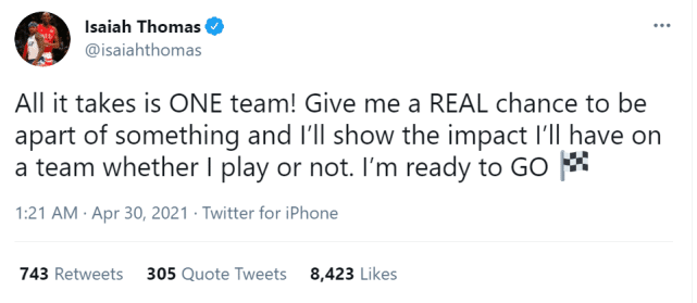 2020年2月,小托马斯被交易到快船后,很快就被裁掉。今年4月4日,他终于等到了鹈鹕的一份10天短合同,可是效力3场比赛后,鹈鹕并没有为他提供第二份合同,小托马斯再次成为自由球员。