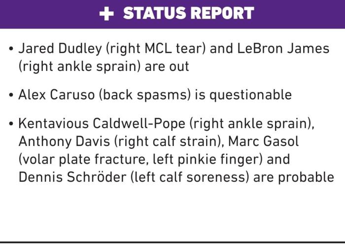 JRS直播网讯 北京时间4月30日,洛杉矶湖人公布下一场对阵国王的伤病报告,勒布朗-詹姆斯因脚踝扭伤继续休战,卡鲁索被列为出战成疑,浓眉(小腿拉伤)、波普(脚踝扭伤)、小加索尔(手指骨折)和施罗德(小腿酸痛)都是大概率出战。