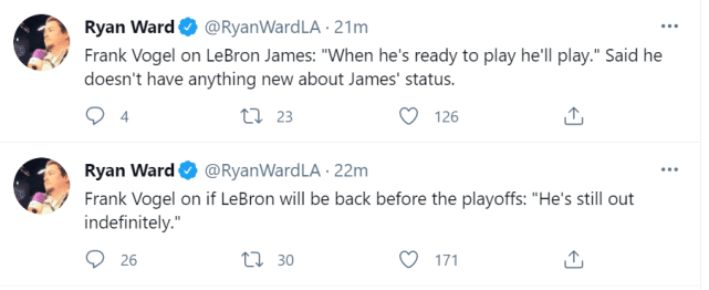 JRS直播网讯北京时间4月29日,湖人客场对阵奇才,赛前,有记者问到詹姆斯能否在季后赛前回归,沃格尔的回应和之前一样:“他仍然是无限期休战。”此前美媒报道称詹姆斯将在本周复出,无缘出战奇才后,外界普遍认为詹姆斯将在对阵国王或者猛龙的比赛中回归,可是不到消息确定的那一刻,沃格尔始终不愿透露半点风声。
