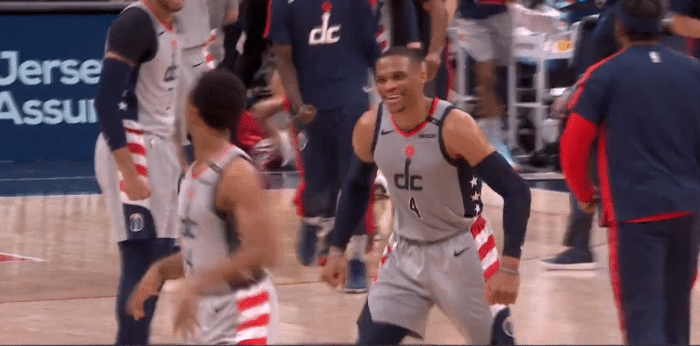 虽然浓眉末节轰下14分带队反扑,但韦少三分、强硬突破给出回应,坐在地板上握拳怒吼庆祝,由于输赢早早失去悬念,湖人换下主力,放弃比赛,最终107-116又输给奇才。