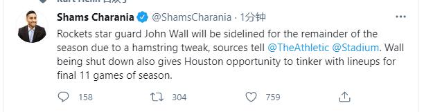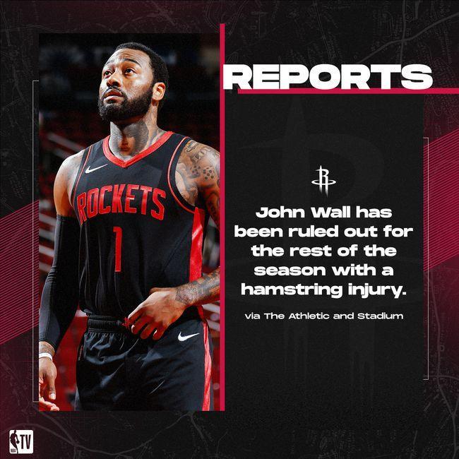 JRS直播网讯 北京时间4月27日,据名记Shams报道,消息人士透露,火箭球星沃尔将因腿筋拉伤缺席本赛季剩余比赛,交易来球队后一直没出战的艾克萨姆也赛季报销!