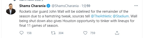 JRS直播网讯 北京时间4月27日,火箭核心球星约翰-沃尔提前赛季报销,据名记shams报道,火箭后卫沃尔因腿筋拉伤不会出战剩余的比赛,提前赛季报销;随后火箭记者麦克马洪证实,沃尔遭遇腿筋二级拉伤,本赛季不会再为火箭出战。此前篮网球星哈登也是因腿筋伤病而常规赛报销。