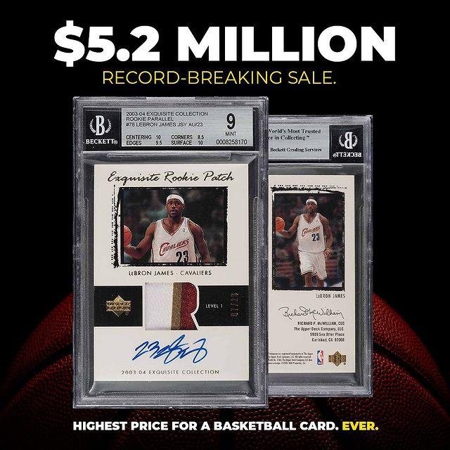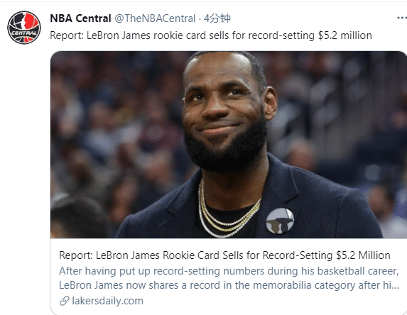 此前东契奇460万美元球星卡创造NBA历史纪录,如今詹姆斯球星卡再创历史新高,售出520万美元的天价;此前詹姆斯新秀卡还曾多次卖出100多万美元的价格。