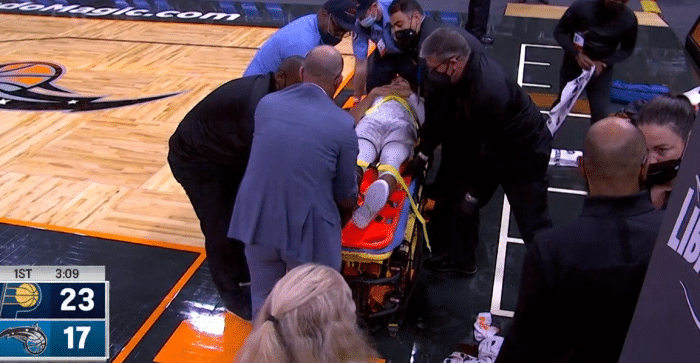 JRS直播网讯北京时间4月26日,魔术和步行者比赛中,场上发生意外受伤事件,魔术十天短合同球员德文-坎纳迪惨遭重伤,才上场仅打1分钟却不幸重伤离场,小腿严重受伤,被工作人员用担架抬离现场。