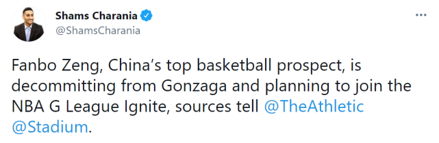 JRS直播网讯 北京时间4月25日,据The Athletic名记查拉尼亚报道,中国顶级年轻球员曾凡博将不会前往冈萨加大学,而是计划加入NBA发展联盟(G联赛)的点燃队。