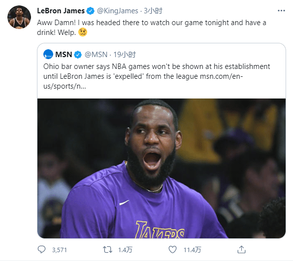 JRS直播网讯 此前俄亥俄州辛辛那提的酒吧老板呼吁联盟赶紧开除詹姆斯,否则就在酒吧内禁止播放NBA比赛;对此,湖人当家巨星勒布朗-詹姆斯已经公开回应酒店老板的言论;詹姆斯转发这一言论,发推写道:真该死!我本想今晚就去那里喝一杯,然后看我们的比赛呢!