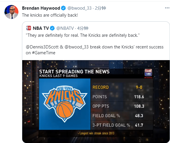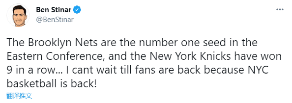 Ben Stinar发推写道:布鲁克林篮网排名东部第一,尼克斯豪取9连胜,我迫不及待的想要球迷回归,因为纽约篮球回来了。