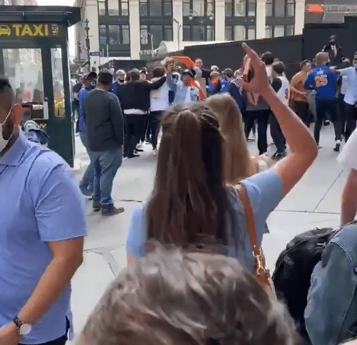 很快一名身穿篮网球衣的球迷误入其中,很显然他是走错了地方。而尼克斯的球迷们瞬间就将这名篮网球迷给围住了,口号也从此前的给尼克斯加油,变成了大骂篮网,很明显是F字眼打头的。