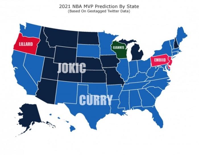 JRS直播网讯 对于NBA这种商业联盟来说,光有实力有些时候其实还是不够的,因为一个球星不仅需要赛场上的实力,在场外也需要有很高的人气。毕竟NBA很多奖项还有全明星的评选都需要人气来支撑,很多有实力却没有人气的球员可能都没办法进入全明星。而一家专门统计社交媒体数据的媒体就发布了一个NBA的本赛季MVP地图,上面有着美国各州球迷对于球星的支持力度,从这里可以看出这些州希望哪个球星拿到MVP。