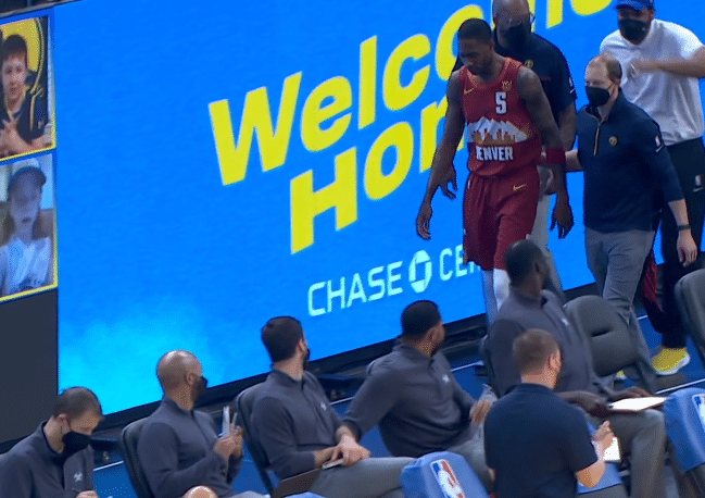 悲剧啊,威尔-巴顿是掘金首发后卫,可是对阵勇士,巴顿仅仅只打59秒就受伤离场,一瘸一拐坐回更衣室;从现场画面来看,巴顿有可能是大腿后侧受伤,目前他已经返回更衣室,接受检查,但愿巴顿伤势无大碍。