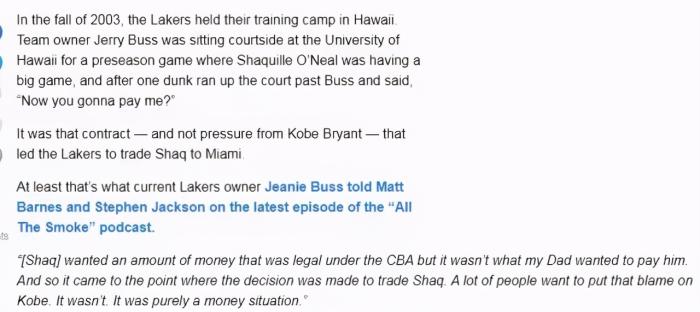 JRS直播网讯 北京时间4月23日,湖人老板珍妮巴斯参与栏目时谈到了球队当年交易走奥尼尔一事。珍妮表示:“当年奥尼尔希望得到一份大合同,但是我的父亲杰里巴斯不想给他那么多钱,所以球队就决定交易奥尼尔。很多人将此事归咎于科比,但事实并非这样,纯粹是因为钱。”
