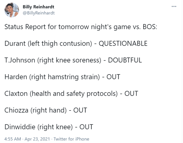 JRS直播网讯 北京时间4月23日,篮网官宣了明天主场对阵凯尔特人的伤病名单。杜兰特(左大腿挫伤)的状态提升为QUESTIONABLE(上场可能50%),有望在休战两场后迎来复出。泰勒-约翰逊(右膝酸痛)的状态是DOUBTFUL(大概率不打,上场可能25%)。另外哈登(右腿筋拉伤)、克拉克斯顿(健康安全协议)、齐奥扎(右手伤病)、丁威迪(右膝伤病)仍是缺战的状态。