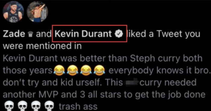JRS直播网讯 杜兰特除了是NBA超级巨星,他还是最接地气的球员,拥有很多绰号,“书包杜”,“民工杜”等。而杜兰特最喜欢在网上冲浪,他经常和球迷互动,而且言辞犀利,不经意间就让对手哑口无言,总结下来,杜兰特的怼人热点为:伤害性不大,侮辱性极强。