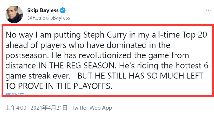 JRS直播网讯 北京时间4月21日,尽管库里在4月打出了疯狂至极的表现,个人场均得分超40分,可即便如此,美国名记skip bayless认为没有把他排进NBA历史前20巨星的行列!