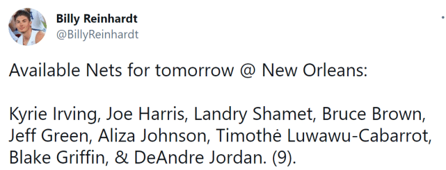 篮网记者Billy Reinhart列出了能上场的9名球员:欧文、哈里斯、沙梅特、布朗、格林、阿利兹-约翰逊、卡巴罗特、格里芬和小乔丹。纳什在调配阵容方面,显然会有些捉襟见肘。