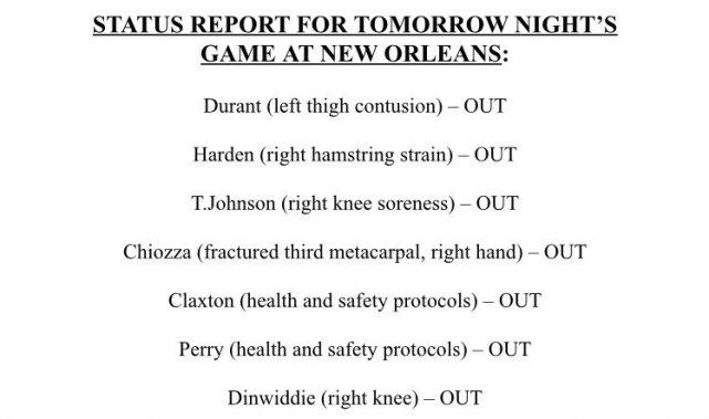 JRS直播网讯 北京时间4月20日,篮网官方公布了明天客场对鹈鹕的伤病名单,多达七名球员被贴上了OUT(缺席)的标签。杜兰特(左大腿挫伤)、哈登(右腿筋拉伤)、泰勒-约翰逊(右膝酸痛)、齐奥扎(右手骨折)、克拉克斯顿(健康安全协议)、佩里(健康安全协议)、丁威迪(右膝伤病)都不能出战这场比赛。这意味着欧文将单核带队来打这场比赛。