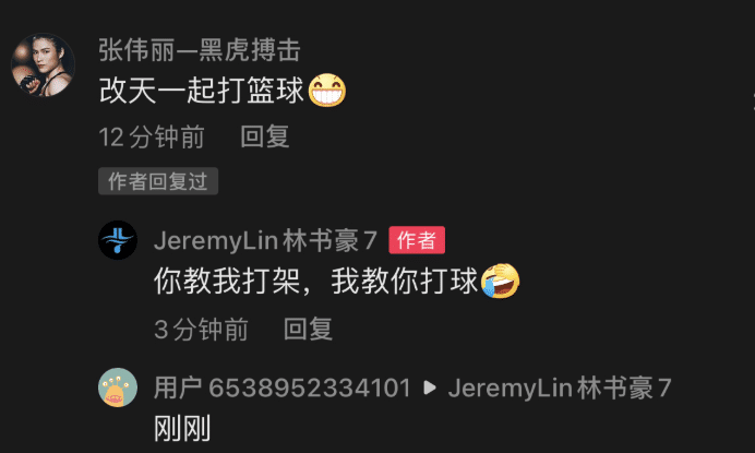 很快这则动态就获得了上万球迷的点赞,而张伟丽本人看到好之后也是回应到:“改天一起打球。”林书豪回复:“你教我打架,我教你打球。”