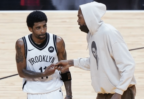 最后3分31秒篮网107-101领先6分,此后篮网全队一分未得,最后90秒欧文连续三次投篮打铁,阿德巴约压哨绝杀;篮网输球后,镜头给到杜兰特和哈登,他们两人对话,虽然不知道他们在说什么,但可以看出,他们有些沮丧。