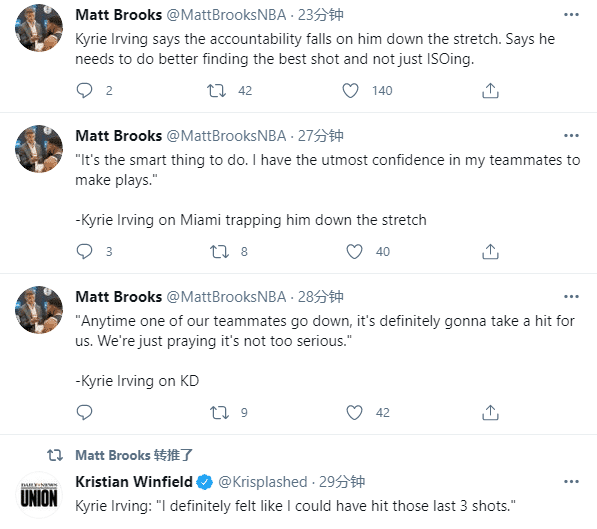 哈登缺席比赛,杜兰特因伤提前离场,欧文单核带队遭绝杀,毫无疑问他该为输球背锅;赛后欧文主动揽责,直言输球的责任在于自己,并且表示自己需要做得更好,而不是持续地单打,再单打。