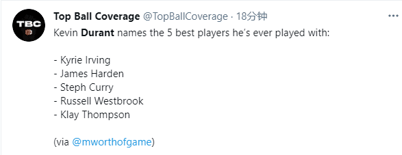 32岁杜兰特戴着一顶小黄帽,第一个说出的名字是凯里-欧文,紧接着说出詹姆斯-哈登和勇士水花兄弟,然后思考片刻后说出伊巴卡的名字;不过主持人直呼DAMN,他们都为韦少落榜而不满,随后杜兰特表示自己忘了,韦少该进入前五,并且把韦少放在第四位,伊巴卡落榜。