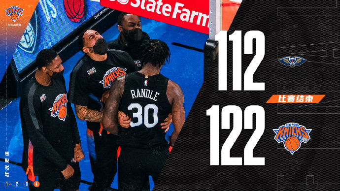JRS直播网讯:北京时间4月19日,2020-21赛季NBA常规赛继续进行,纽约尼克斯队在主场迎战新奥尔良鹈鹕队。最终,尼克斯队以122-112战胜鹈鹕队。