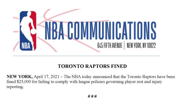 JRS直播网讯NBA联盟又开出一笔罚单,据名记shams报道,多伦多猛龙队因没有遵守联盟关于球员休息和伤病报告的政策而被罚款25000美元;猛龙违反规定被罚款25000美元,随后NBA官宣这一罚单,如此事件引热议,名记吐槽联盟早就受够了。