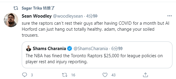 记者Sean Wondley发推写道:猛龙队球员遭受新冠病毒一个月却不能休息,艾尔-霍福德却可以健康地出去玩,联盟总裁,赶紧换掉你的脏裤子;名记Tim Reynolds则是发推写道:我早就说过联盟今年早就受够了轮休,但没人听。