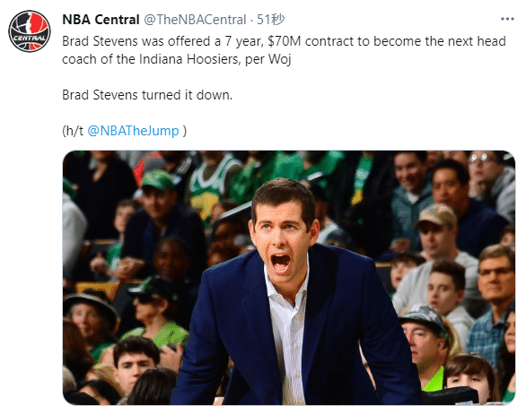 JRS直播网讯北京时间4月18日,据ESPN名记沃纳罗斯基报道,凯尔特人主帅布拉德-史蒂文斯拒绝了一份来自印第安纳大学7年7000万美元的主教练合同;少帅拒绝7年7000万美元大合同,年薪高达千万美元,目前史蒂文斯年薪不详,去年他和球队达成提前续约合同。