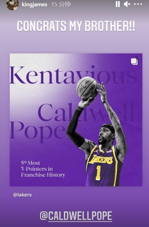 詹姆斯虽然没有上场,但对于这场比赛也是很关注的,他看到好兄弟迎来里程碑时刻的时候,在社交媒体上写到:“祝贺我的兄弟!!”