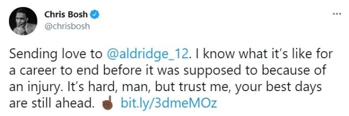 他发推表示“对阿尔德里奇奉上真诚的敬意。我知道一个人的职业生涯因受伤而提前结束是什么感觉。这很艰难,伙计,但相信我,往后有着更美好的生活在等着你。”波什因为肺血栓而退役,目前才37岁的他退役时才32岁,有点惋惜,但是健康永远大于一切!