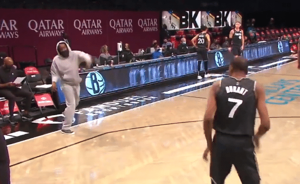 这是比赛进行到第四节,篮网已经取得大比分的领先优势,杜兰特上场之后和哈登互动,哈登本场比赛继续缺席,他在场边给队友加油助威。暂停期间,两人先是聊了一会,随后杜兰特回到场内,哈登则是依旧通过肢体动作和杜兰特进行互动。只见哈登手中有东西,不过在扔的时候他整蛊了杜兰特,而杜兰特连忙躲闪,如同默剧一样,两人都不说话,但动作很多,确实很有趣。